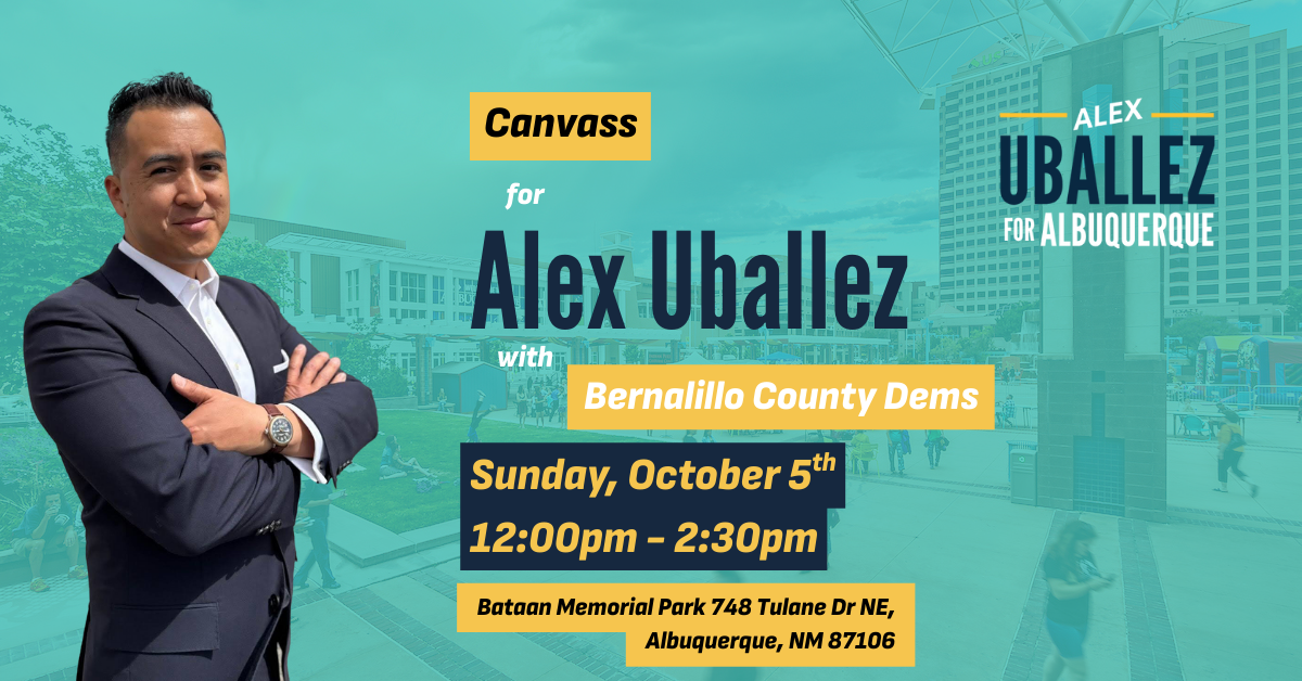 Spend your Sunday making an impact! On October 5th at 12:00 PM, join our volunteer team and the Bernalillo County Democrats for a joint canvass at Bataan Memorial Park (748 Tulane Dr NE, Albuquerque, NM 87106).